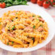 Penne pasta in tomato sauce with sausages and cheese, decorated with parsley on a white wooden table, very tasty.