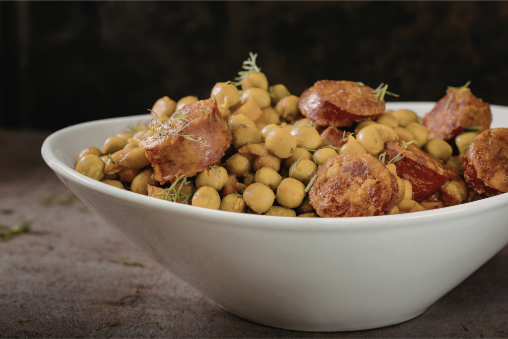 Los garbanzos nos aportan hidratos de carbono complejos y proteína vegetal, mientras que las salchichas suman sabor, proteínas y energía.
